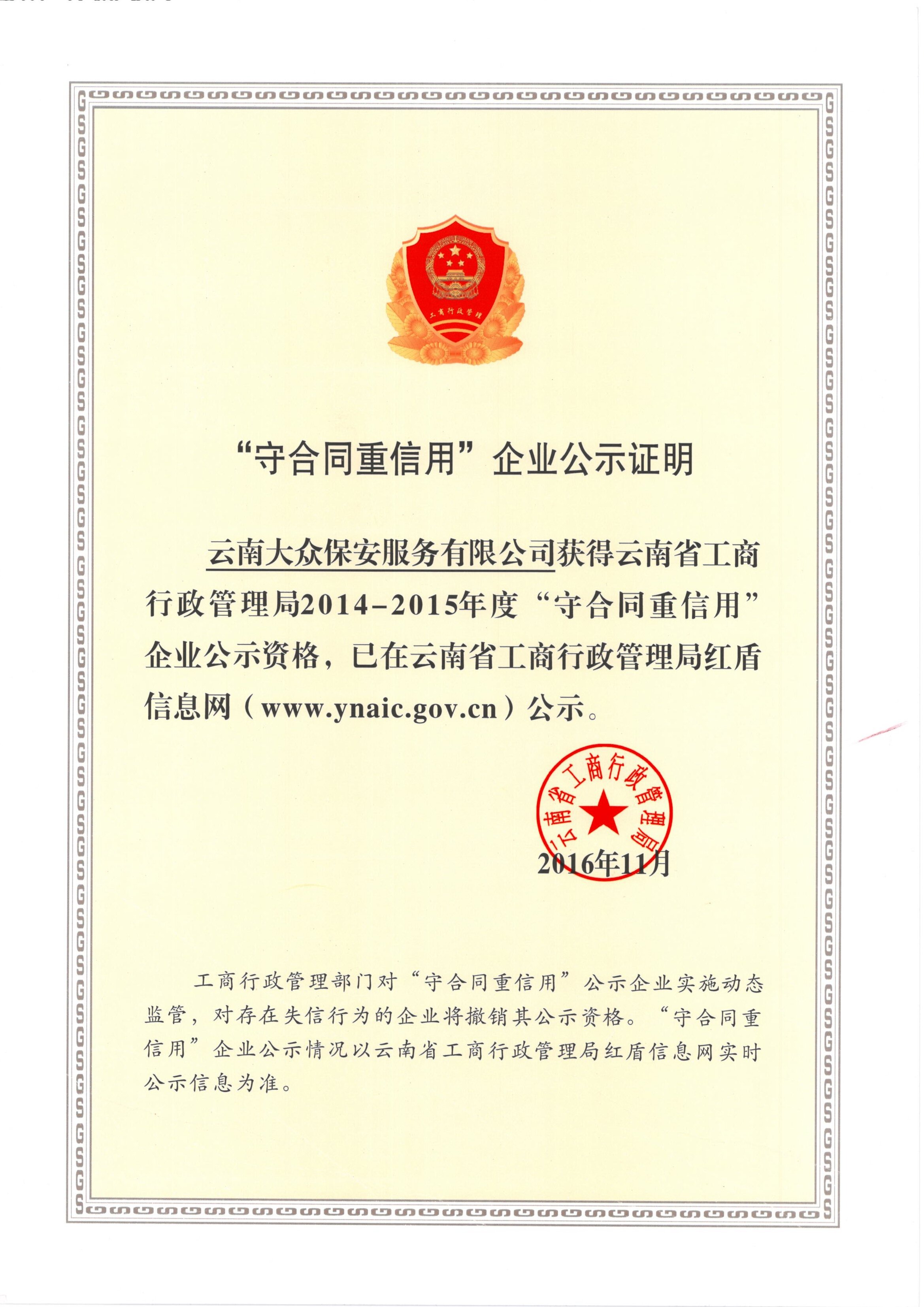 近日,云南大眾保安服務(wù)有限公司被云南省工商行政管理局評為云南省2014-2015年度 “守合同重信用”企業(yè),這是公司在誠信經(jīng)營、守合同重信用上,繼多次被思茅區(qū)市場監(jiān)督管理局、普洱市工商行政管理局評為“守合同重信用”企業(yè)后獲得的更高級別的殊榮。